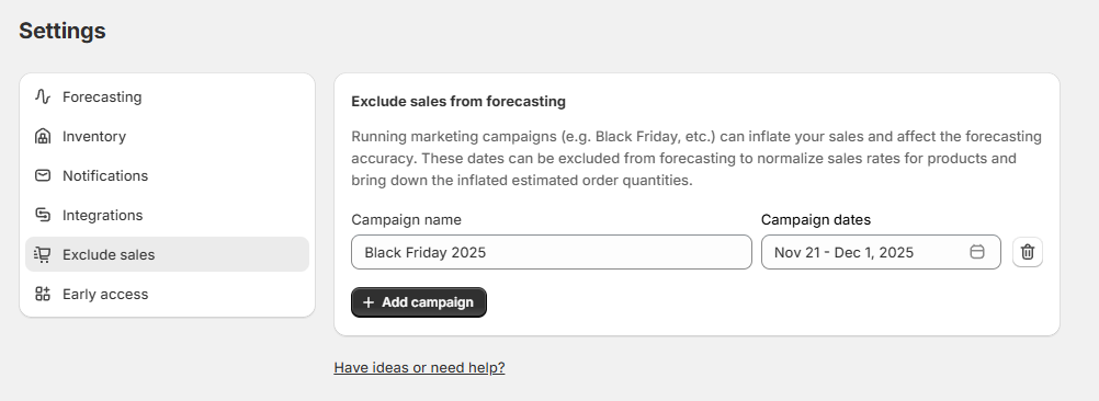 To exclude sales, go to Settings → Exclude Sales, add a campaign name and enter dates for which the sales campaign was active. These dates will not be used to calculate sales rate and predict demand.